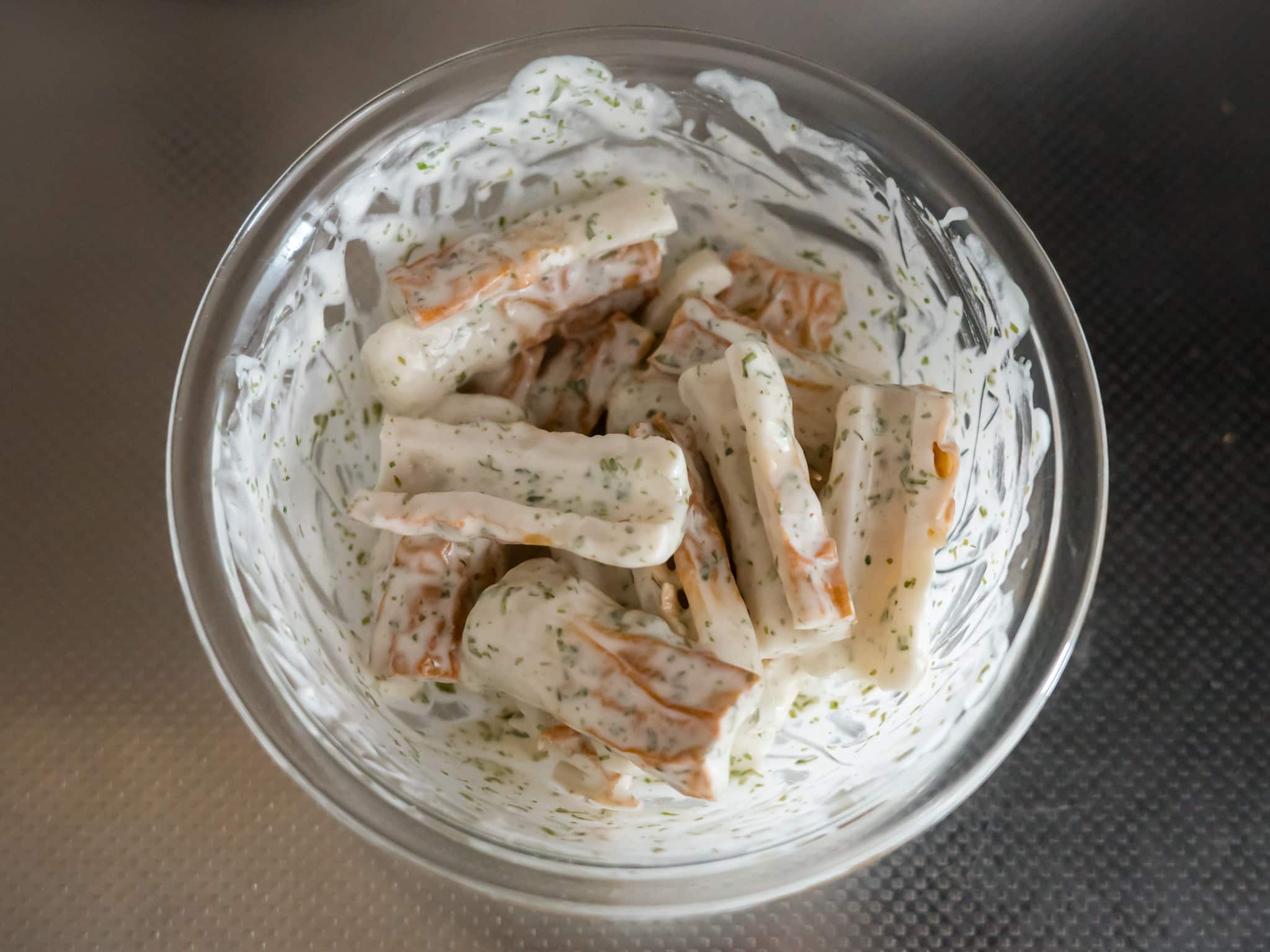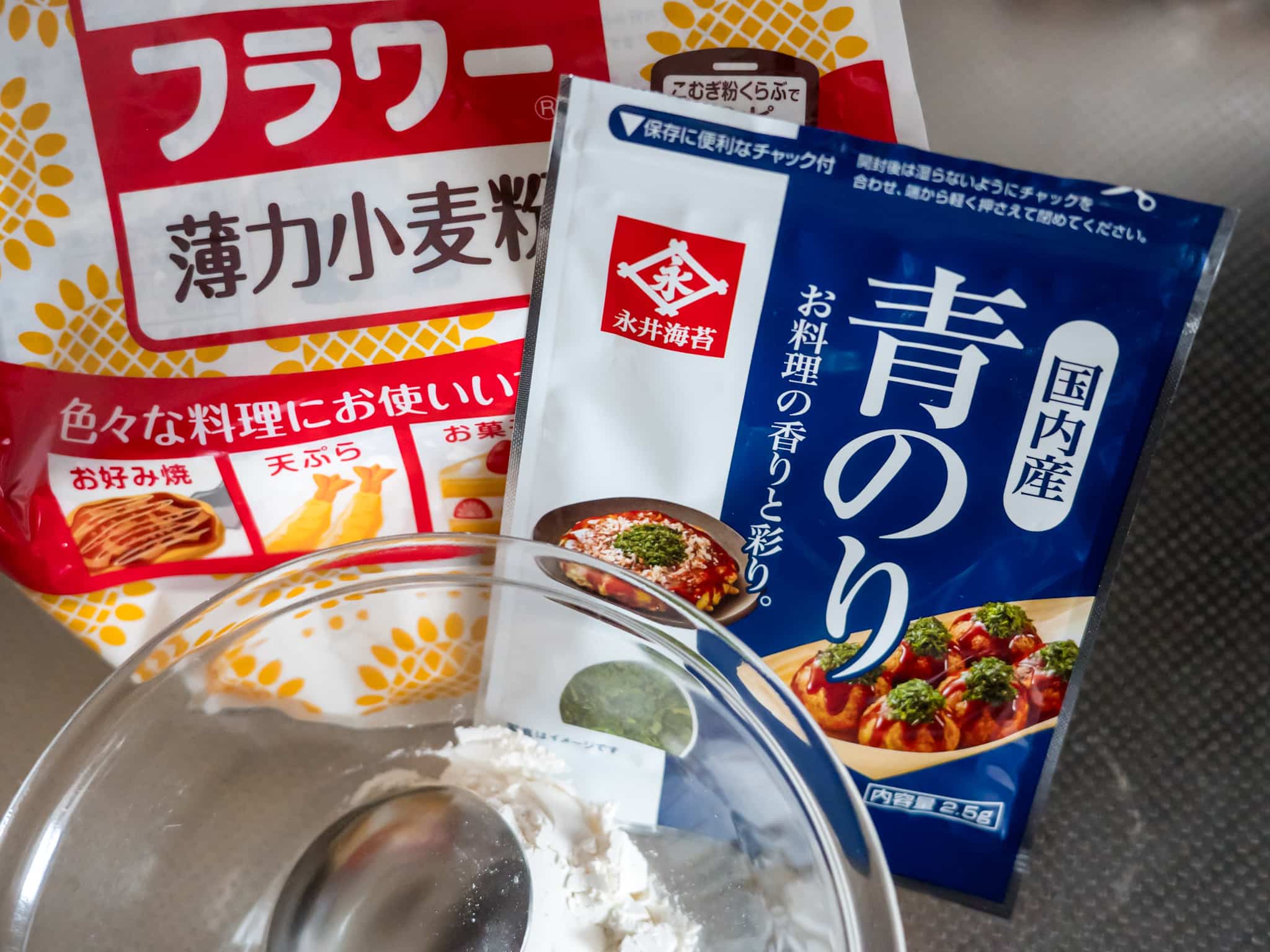 小麦粉と水を大さじ2ずつ、あと青のりを適当に入れて、混ぜる。
