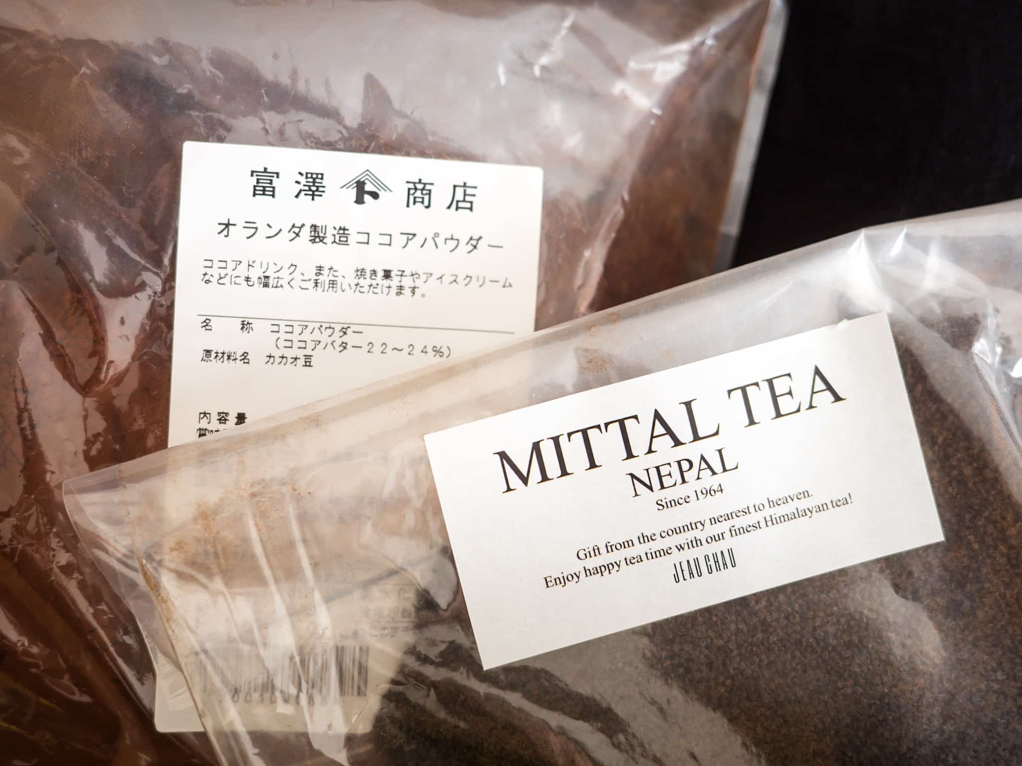 ↑この茶葉(別記事「チャイ用の茶葉「ミッタルティー」使ってみる」で紹介した)と、ココアパウダー(Amazonで買った、富澤商店(TOMIZ)のやつ)を使う。
