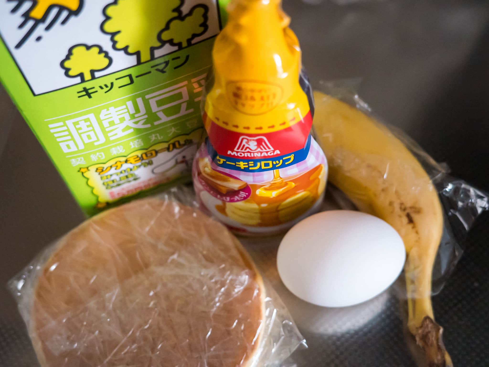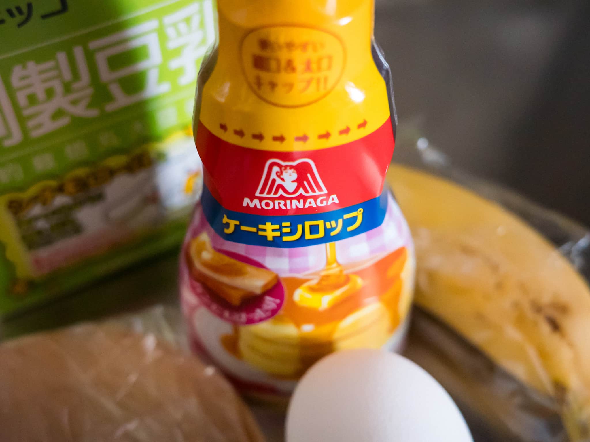 必要なものは、冷凍保存しているホットケーキと、バナナ、卵、牛乳(私は豆乳を使う)、ケーキシロップ。