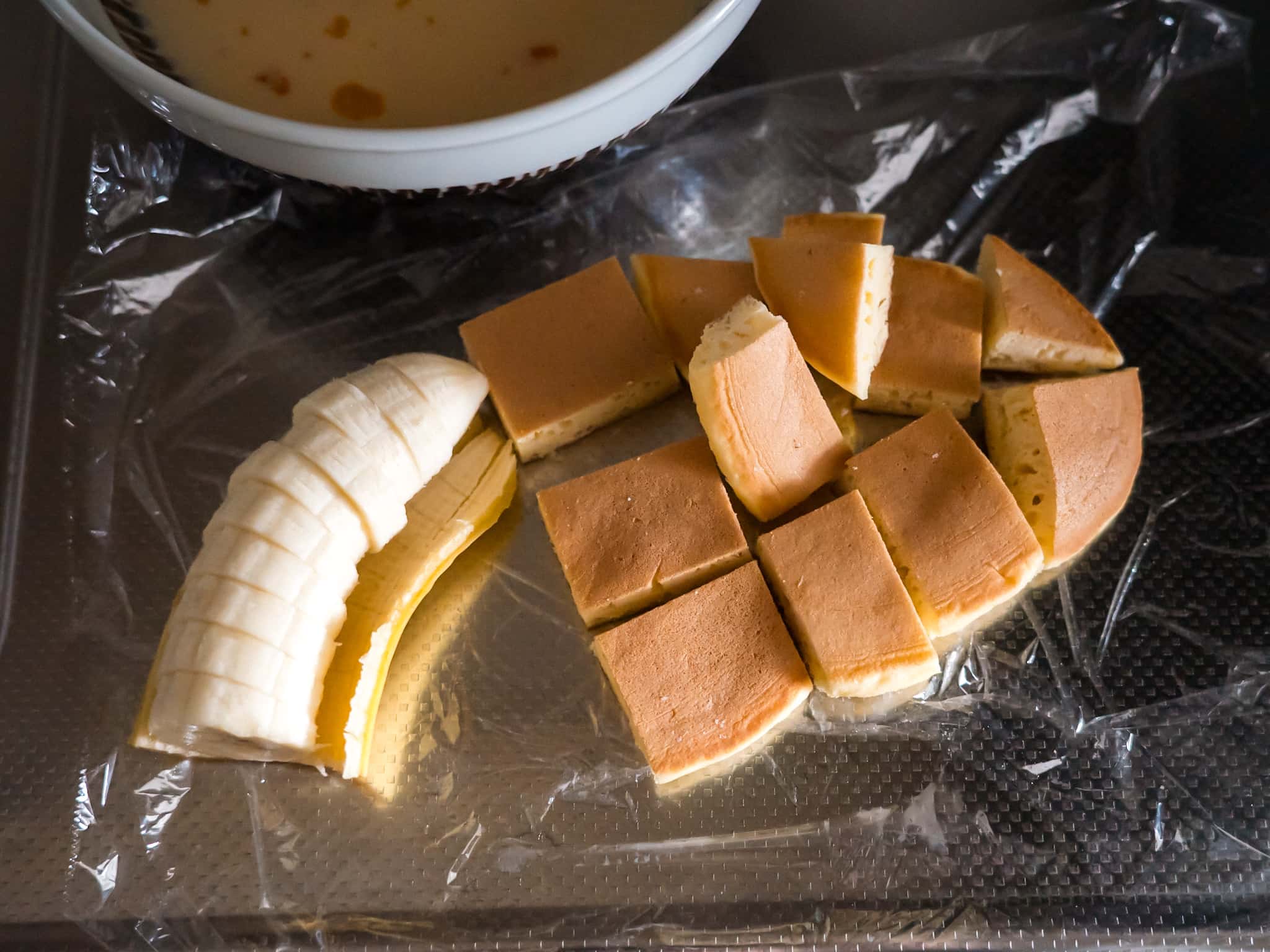 ホットケーキ(凍ったまま)とバナナを、適当に切る。