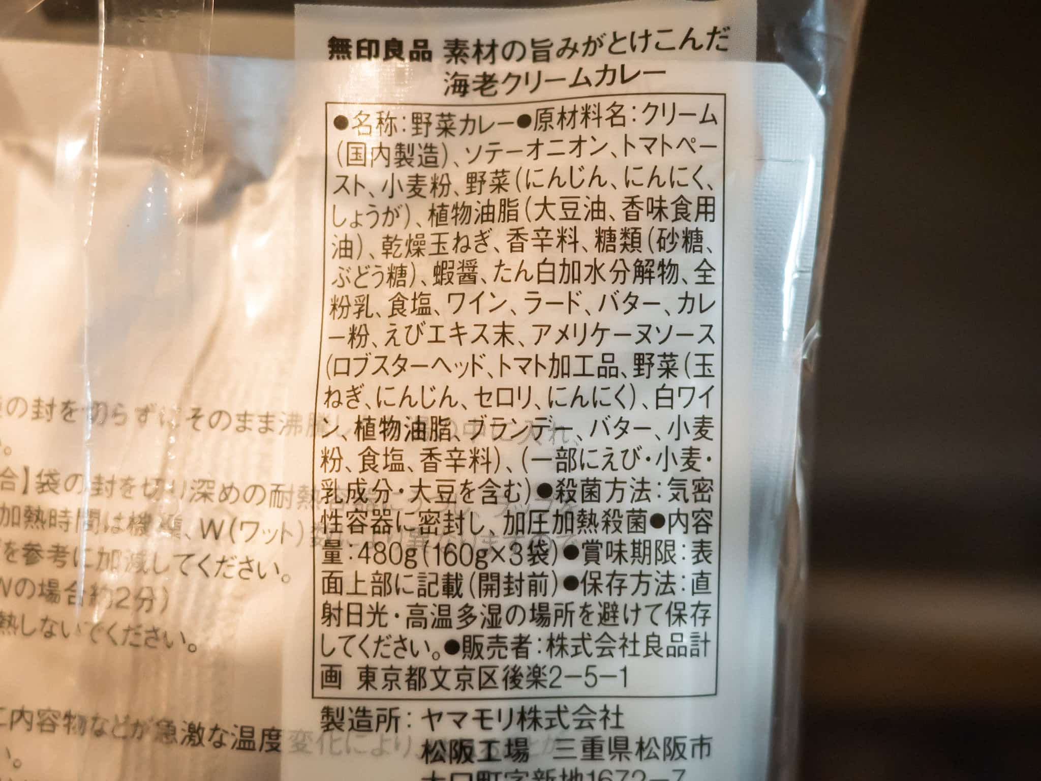 無印良品「海老クリームカレー(3袋入り)」原材料名やカロリー