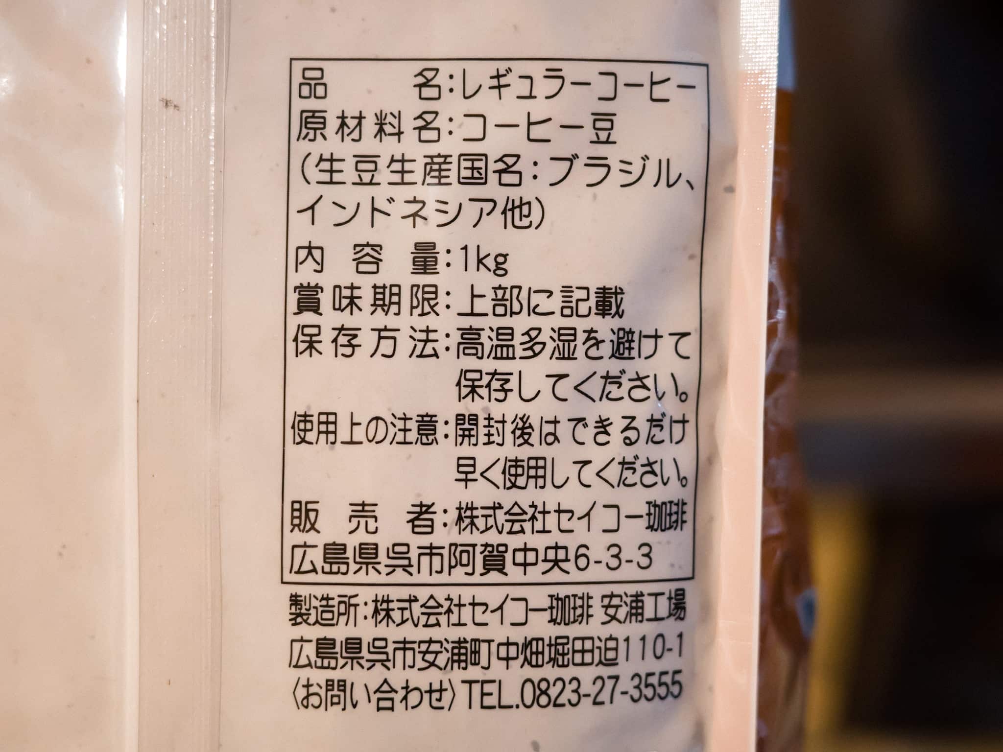 ホテル・レストラン用 セイコー珈琲 豆 原材料名
