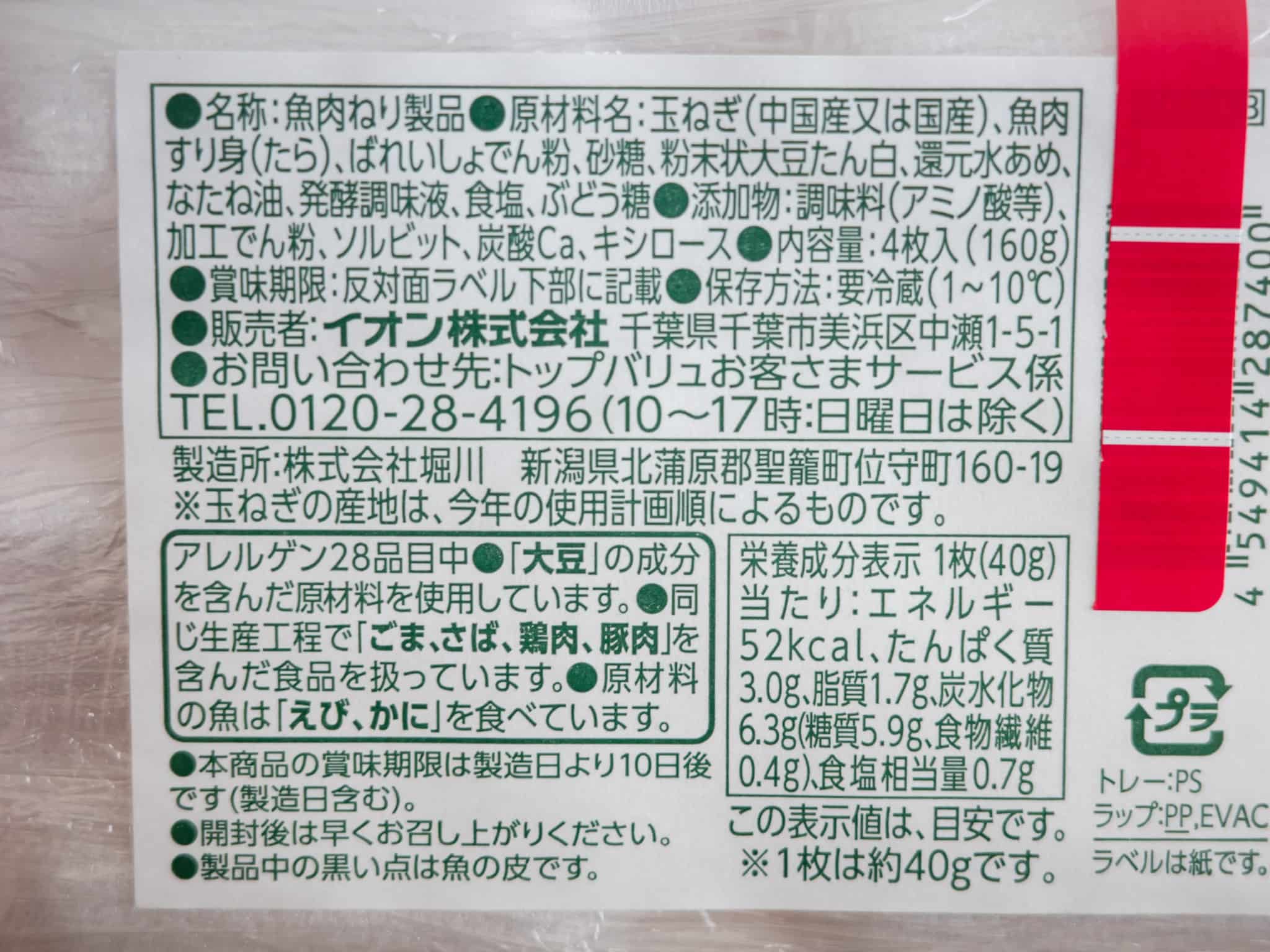 トップバリュ「たまねぎ天」原材料名、栄養成分表示など